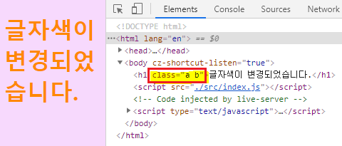 - 한번 클릭 후에는 클래스명이 b도 추가되었고 동시에 설정해두었던 텍스트와 색상이 변경됨