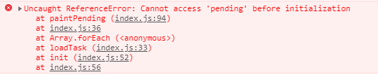 삽질기록장/에러모음집 [에러] Uncaught ReferenceError: Cannot access 'pending' before initialization by 진아리♡ 2021. 1. 29. 728x90 반응형 Uncaught ReferenceError: Cannot access 'pending' before initialization 원인 : 코드에서 변수선언을 함수보다 밑에다 둠 해결 : 변수선언을 위로 올렸더니 해결 반응형 728x90 반응형 공유하기 게시글 관리 Coding With Jina '삽질기록장 > 에러모음집' 카테고리의 다른 글 [에러] 리액트에러 - Uncaught ReferenceError: Cannot access 'data' before initialization (0) 2022.05.18 [에러] 리액트 에러 - Each child in a list should have a unique "key" prop. (0) 2022.05.06 [에러] 리액트 에러 - TypeError: a is not iterable (0) 2022.05.05 [에러] Failed to load resource: the server responded with a status of 404 (Not Found) (0) 2021.01.04 [에러] Uncaught SyntaxError: Unexpected end of input (0) 2020.05.07 관련글 [에러] 리액트 에러 - Each child in a list should have a unique "key" prop. [에러] 리액트 에러 - TypeError: a is not iterable [에러] Failed to load resource: the server responded with a status of 404 (Not Found) [에러] Uncaught SyntaxError: Unexpected end of input