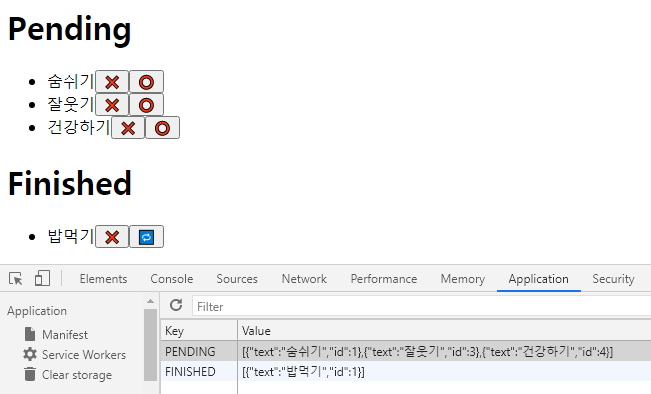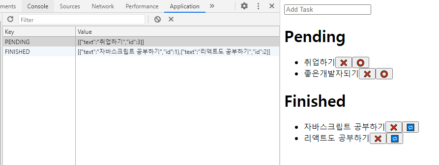 ❌를 누르면 삭제됨 그리고 Finished 리스트에서 🔁를 누르면 다시 Pending으로 넘어가는 시스템