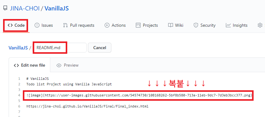 ④ 업로드 하고자 하는 readme에 복붙 후 하단 초록색 커밋버튼 클릭!