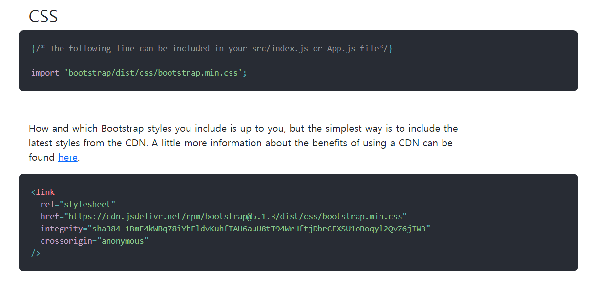 ★ 설치방법은 여기로! => https://coding-with-jina.tistory.com/159 [React Bootstarp] 리액트 부트스트랩 설치하기 1. 먼저 새 프로젝트 하나를 생성해주기 2. 구글에 react bootstrap 이라고 검색해서 나오는..