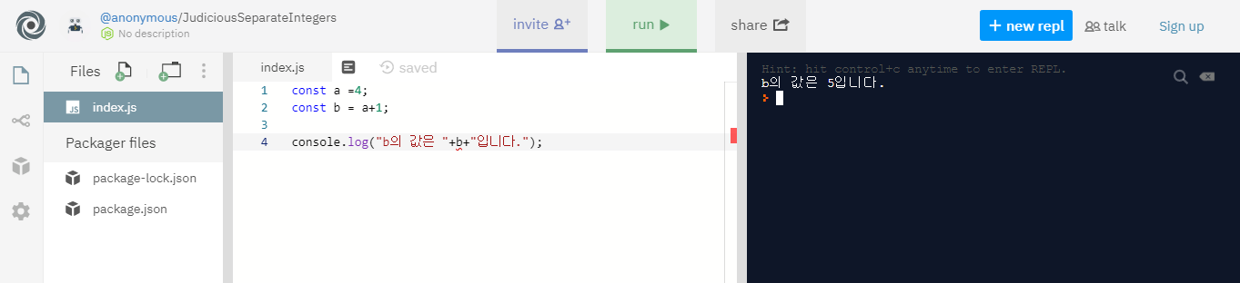 3. 나는 자바스크립트를 선택했다. 이제 코딩을 하고 run을 누르면 원하는 결과를 볼 수 있다!
