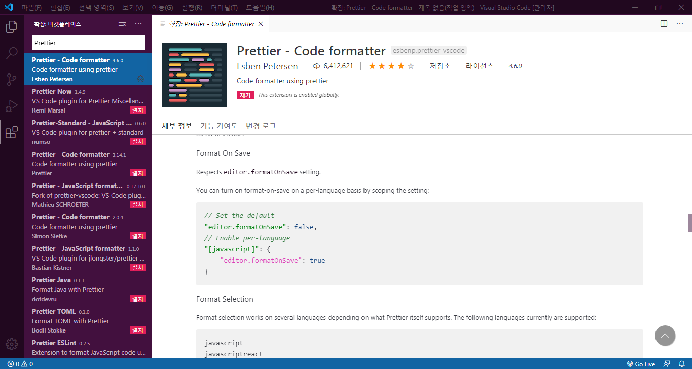 : Visual Studio Code 툴에서 포맷시 코드를 예쁘게 정리해주는 확장 프로그램