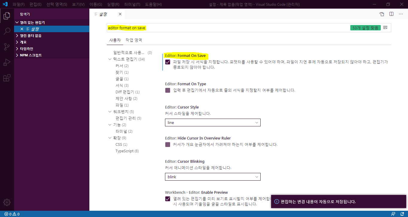 editor format on save를 검색 후 해당 칸에 체크를 눌러 활성화
