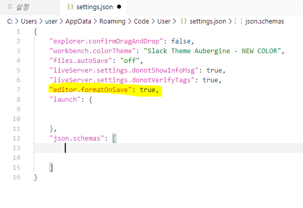 10. "editor.formatOnSave": true 가 되어있는지 확인 후 아무것도 건들지 말고 저장도 하지말고 나올것