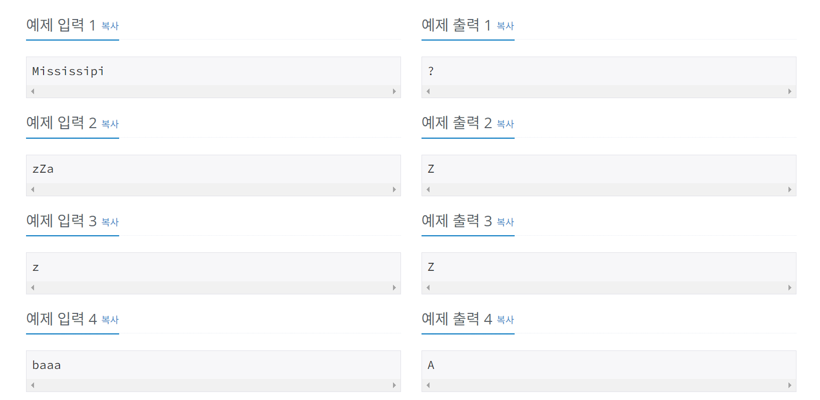 >> 만일 이미 저장된 maxCount와 값이 같은 빈도수가 있다면 문제에 나와있는 것 처럼 ?로 출력하기 위해 result에 ?로 최종 저장한다.