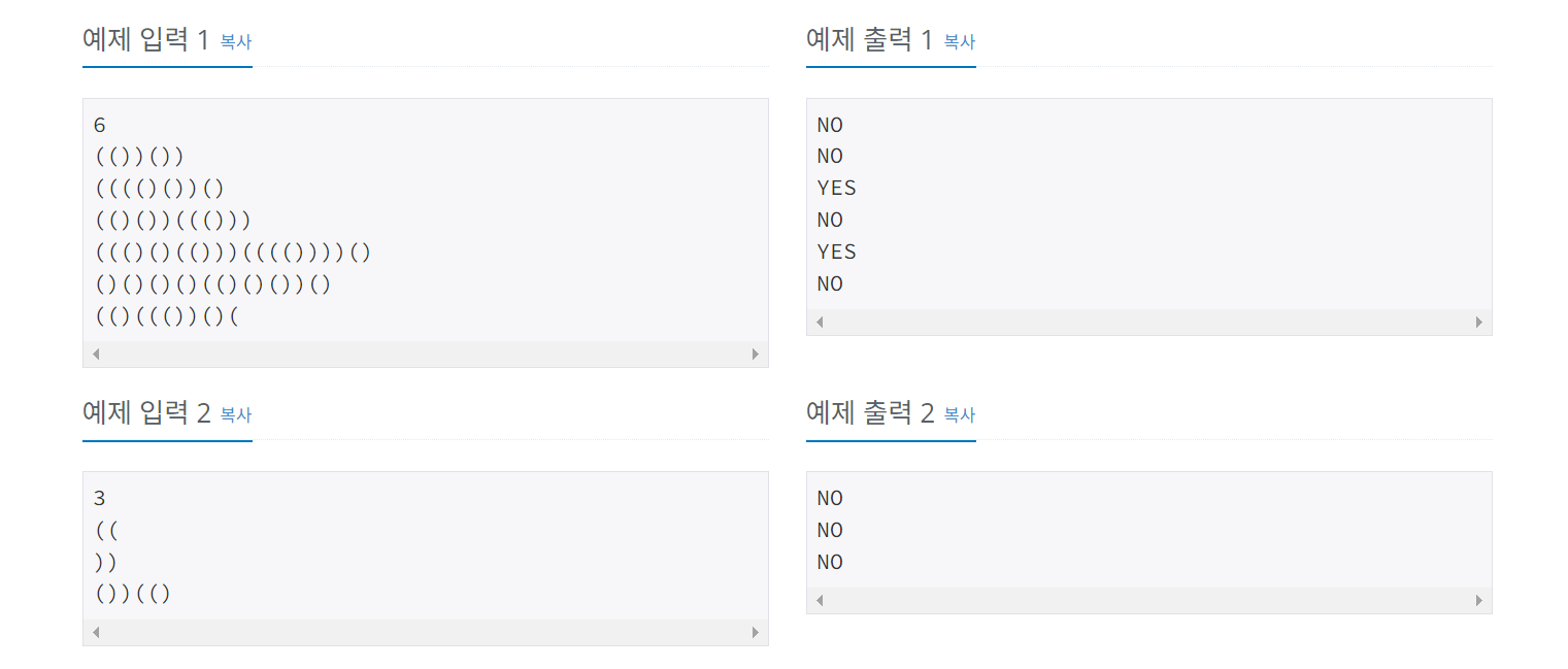 출력은 표준 출력을 사용한다. 만일 입력 괄호 문자열이 올바른 괄호 문자열(VPS)이면 “YES”, 아니면 “NO”를 한 줄에 하나씩 차례대로 출력해야 한다.