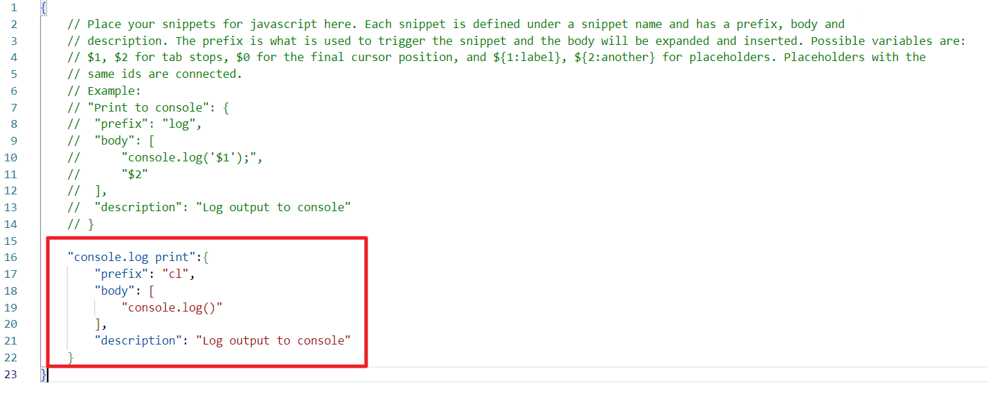 vscode의 상단메뉴>[파일] → [기본설정] → [사용자조각코드구성] → javascript 검색