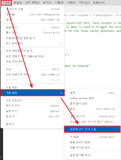 vscode의 상단메뉴>[파일] → [기본설정] → [사용자조각코드구성] → javascript 검색