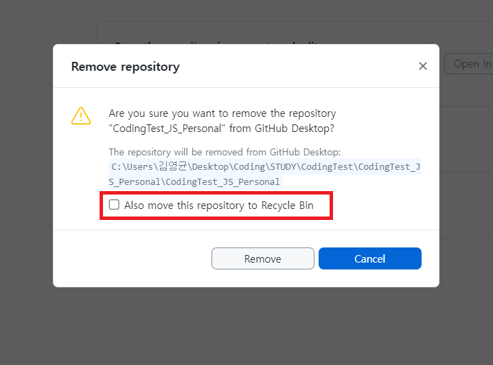 깃허브 데스트탑에서 레파지토리 삭제하기