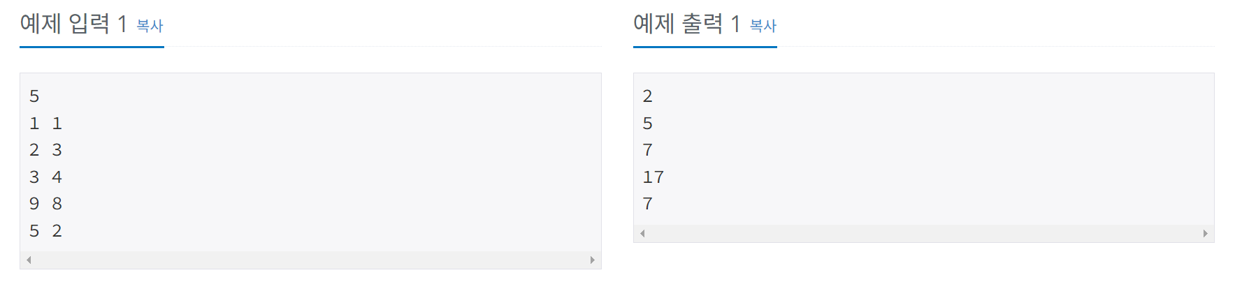 각 테스트 케이스는 한 줄로 이루어져 있으며, 각 줄에 A와 B가 주어진다. (0 < A, B < 10)