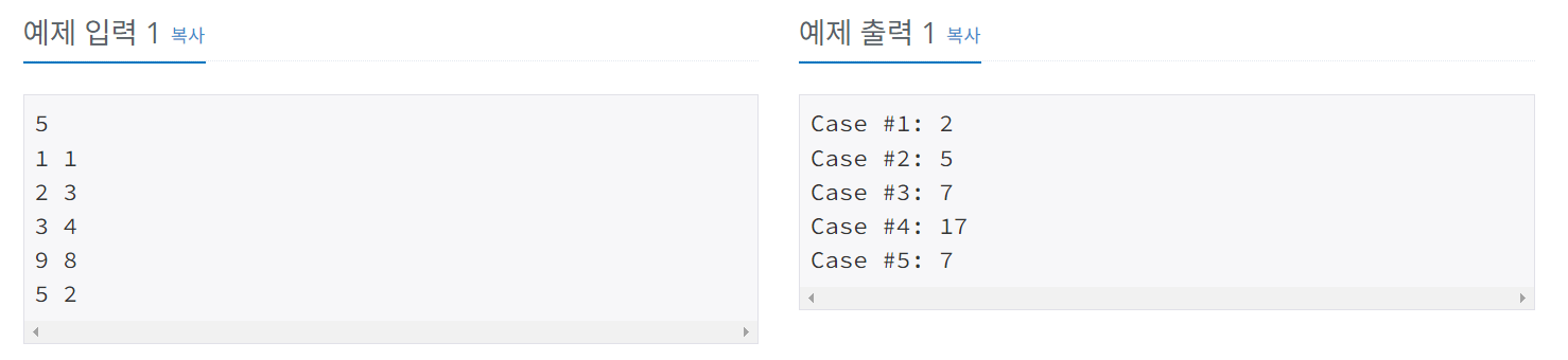 각 테스트 케이스마다 "Case #x: "를 출력한 다음, A+B를 출력한다. 테스트 케이스 번호는 1부터 시작한다.
