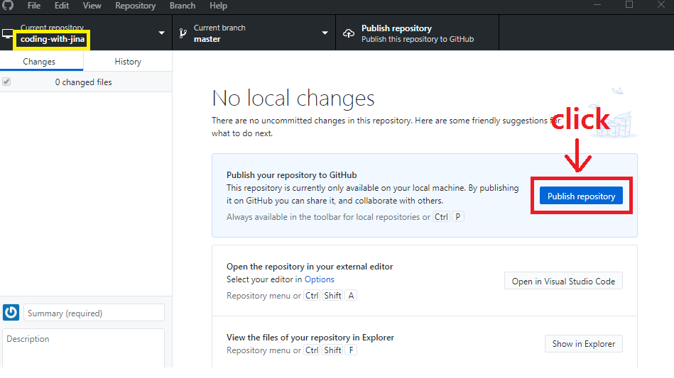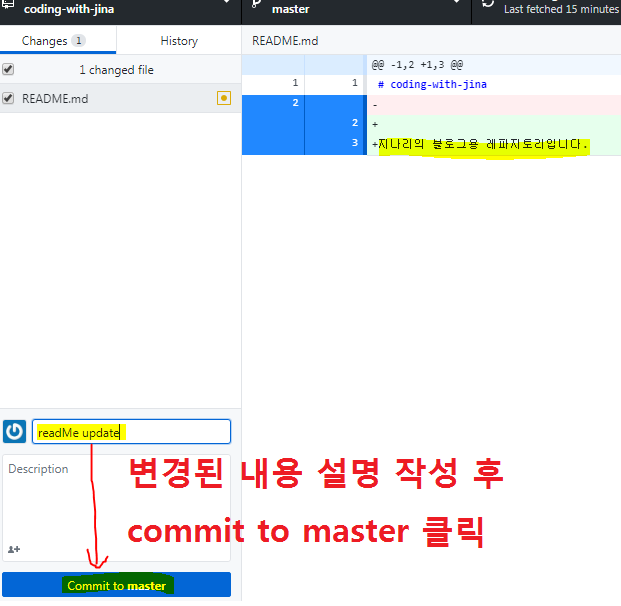 ⑨ GitHub Desktop에서 업데이트 된 README 확인 후 commit to master 클릭