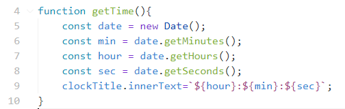 만든 getTime 함수 안에 날짜 객체?를 생성해주고나서 그 객체 안에 있는 분/시간/초를 따로따로 저장시켜준다.