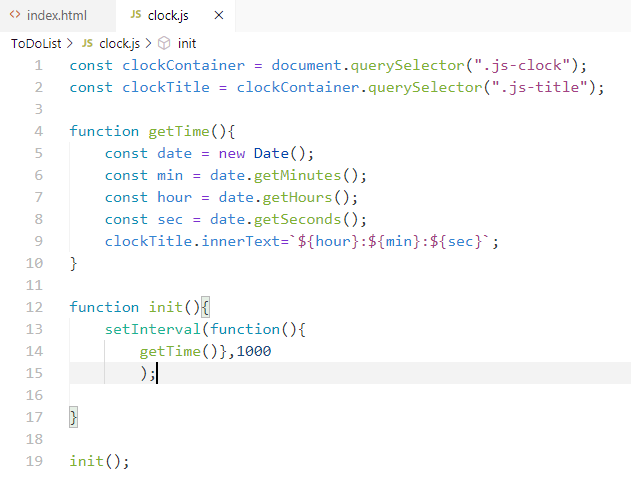 마지막으로 clockTitle에 innerText라는 속성을 이용하여 00:00 대신에 진짜 시간이 들어갈 수 있게 해준다.
