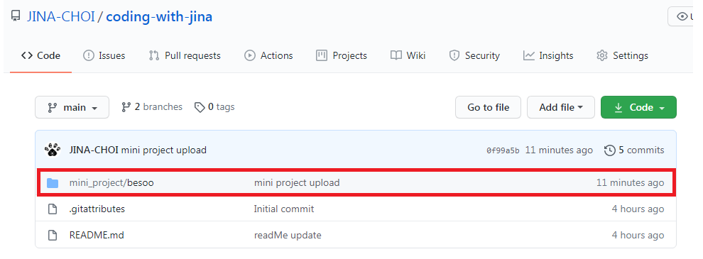 ⑦ 깃허브 웹사이트에서 확인해보면 mini project 파일이 잘 들어간 것을 확인할 수 있다.