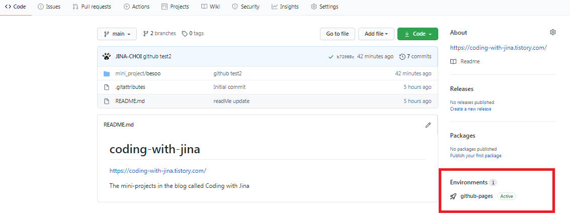 ⑥ 깃허브 웹사이트 오른쪽 하단에 Environment 밑에 있는 github-pages 클릭하면 잘 들어왔는지 확인 가능